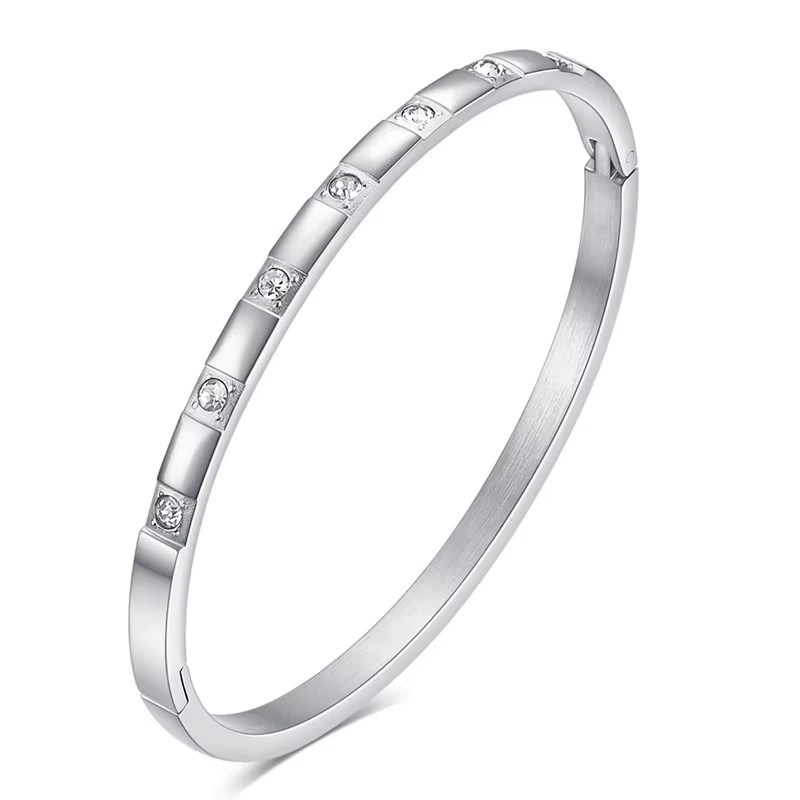 - The look you love — stainless steel and 2.7mm premium cubic zirconia stones make up this timeless 4mm wide bangle. This tarnish-resistant bracelet has a 50mm x 59mm inner diameter. This bracelet dupe features an easy push-and-pull hinge clasp.